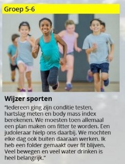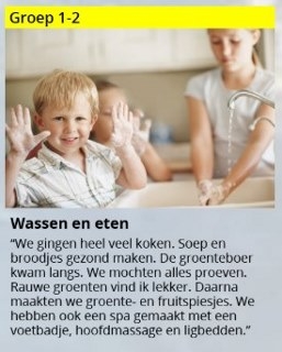 - Van wassen tot werken aan de conditie: kinderen leren over lichaamsverzorging, hygiëne, verzorging van zintuigen, hun conditie en de invloed van hun leefstijl op hun lichaam.